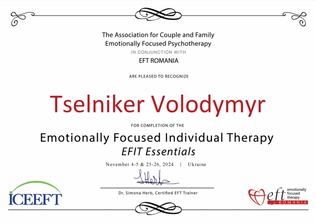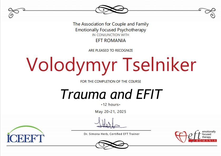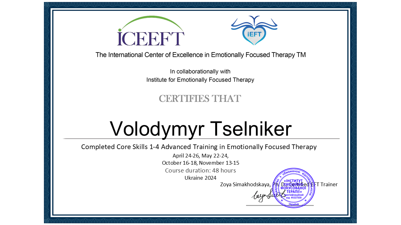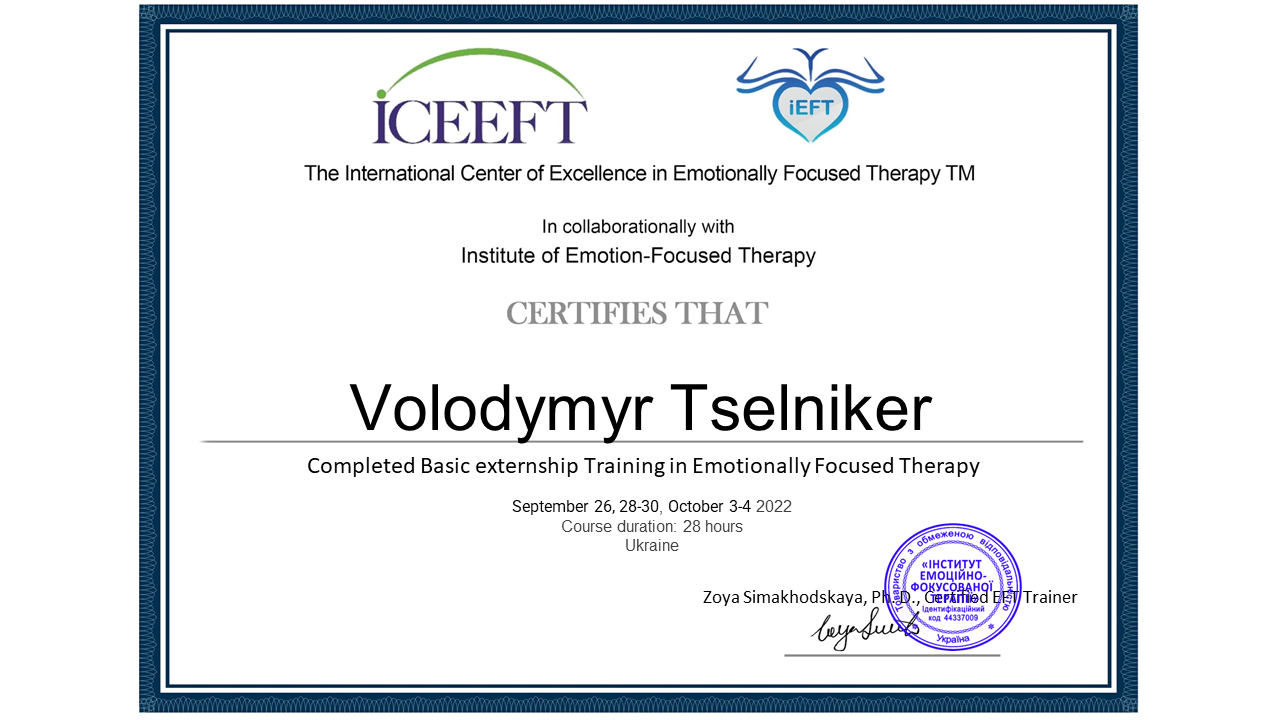 2022 — Базовий тренінг «Emotinally Focused Therapy» (EFT), ICEEFT / Інститут емоційно-фокусованої терапії