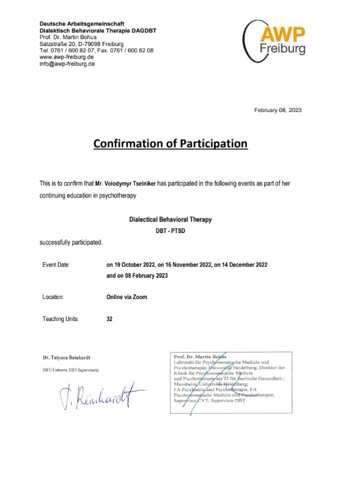 2022 – 2023 — Участь у програмі «Dialectical Behavioral Therapy – DBT-PTSD», викладачі: Dr. Tatyana Reinhardt, Prof. Dr. Martin Bohus