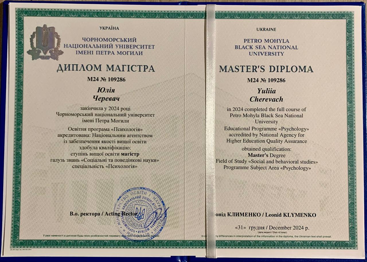 За освітою я магістр психології (ЧНУ ім. Петра Могили). Також маю ще дві вищі освіти та професійний досвід у банківській та IT-сферах.