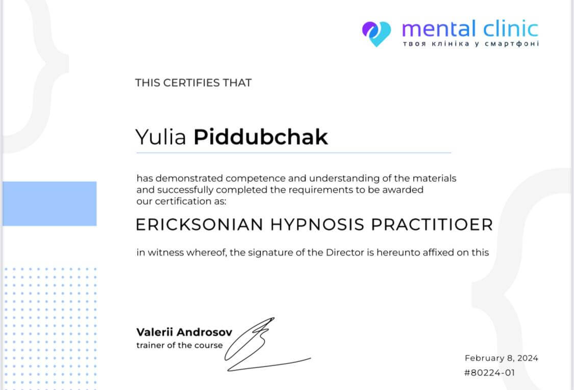 - Еріксоніанський гіпноз у практиці, Ментал Клінік 2024, місяць (інтенсив 36 годин)