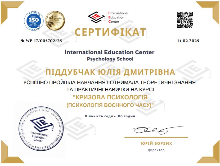 - Кризова психологія (Психологія воєнного часу), International Education Center 2024, 3 місяці (88 годин)
