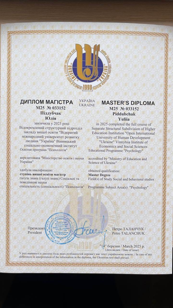 - Міжнародний університет розвитку людини “Україна” Психологія 053, Вінниця 2023 по 2025 (2 роки)