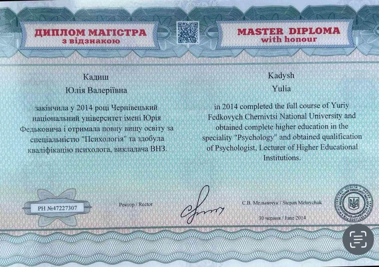 У роботі я поєдную емпатію та професіоналізм. Завжди створюю для клієнта безпечний простір, де можна відкрито говорити про складне. Вірю, що кожна людина має потенціал до змін і моя роль у тому, щоб допомогти вам побачити свої ресурси та впевнено рухатися вперед.