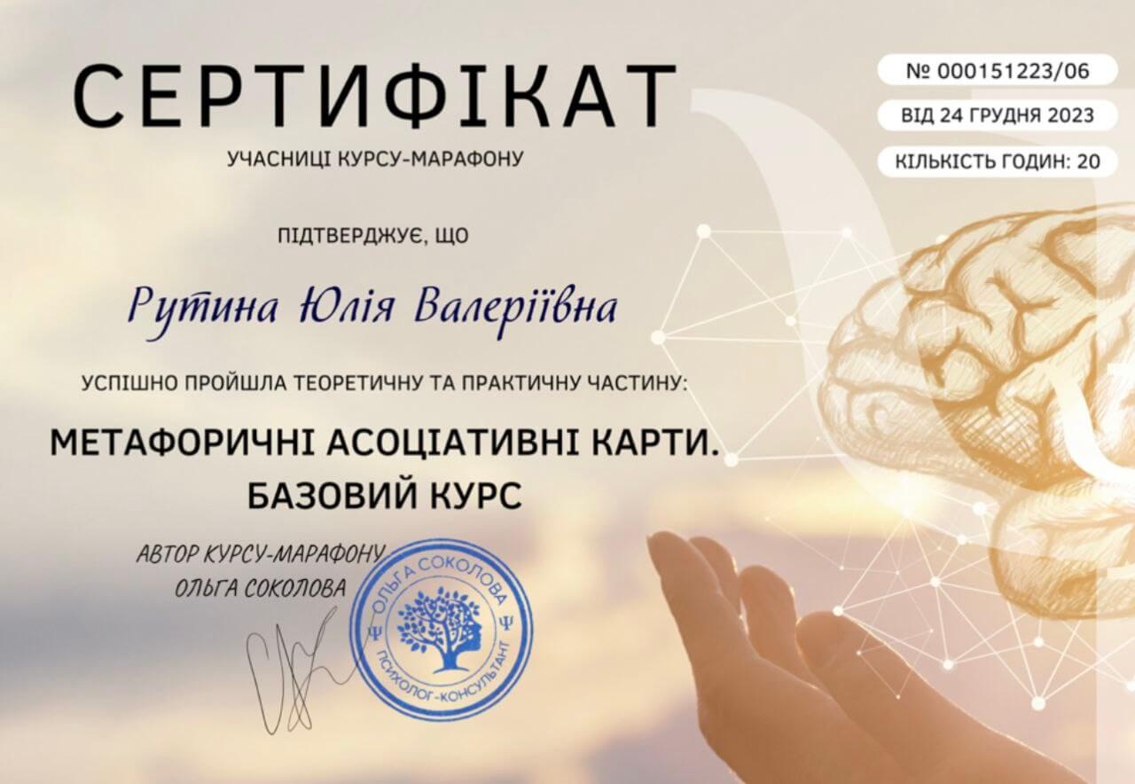 2023 — Метафоричні асоціативні карти: Базовий курс (20 годин), автор курсу Ольга Соколова.