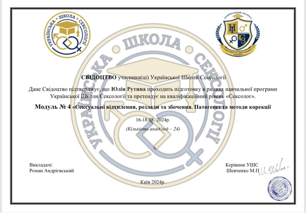 2024 — Модуль №4 «Сексуальні відхилення, розлади та збочення. Патогенез та методи корекції» (24 акад. години), Українська школа сексології.