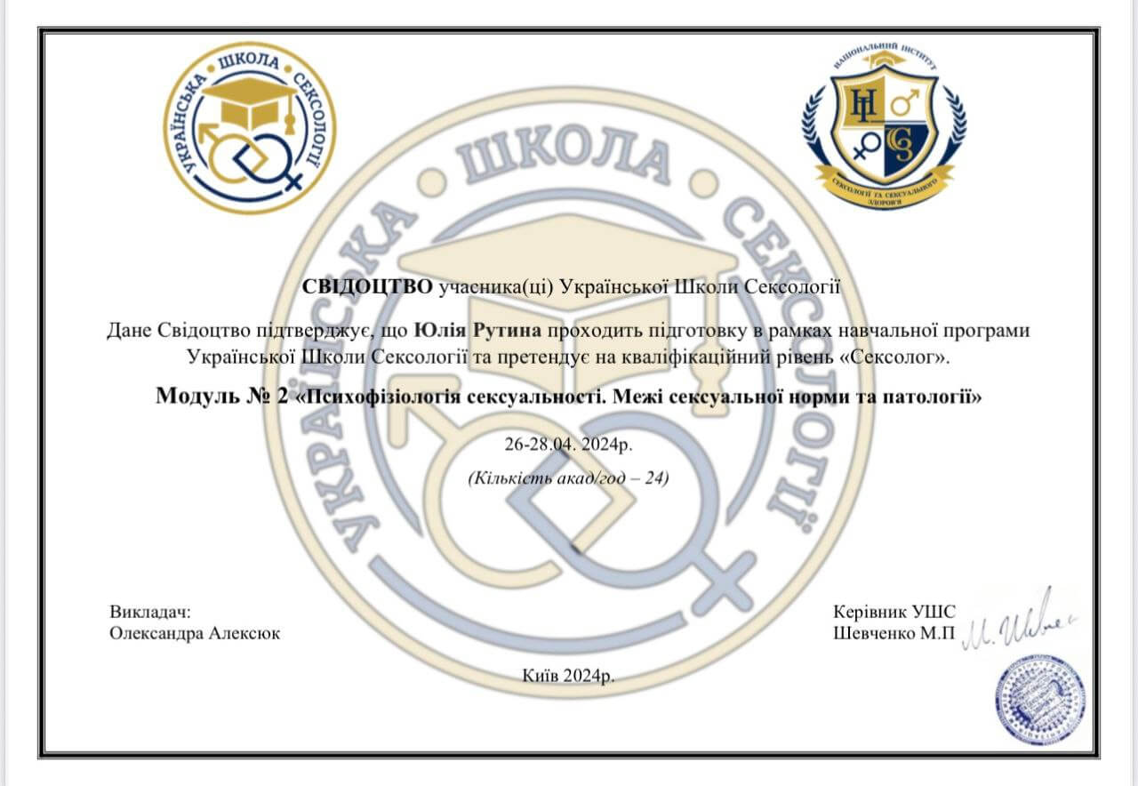 2024 — Модуль №2 «Психофізіологія сексуальності. Межі сексуальної норми та патології» (24 акад. години), Українська школа сексології.
