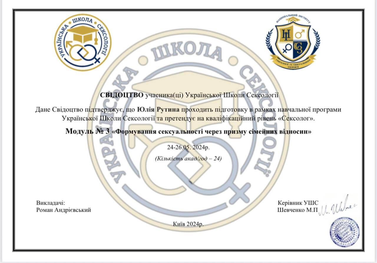 2024 — Модуль №3 «Формування сексуальності через призму сімейних відносин» (24 акад. години), Українська школа сексології.