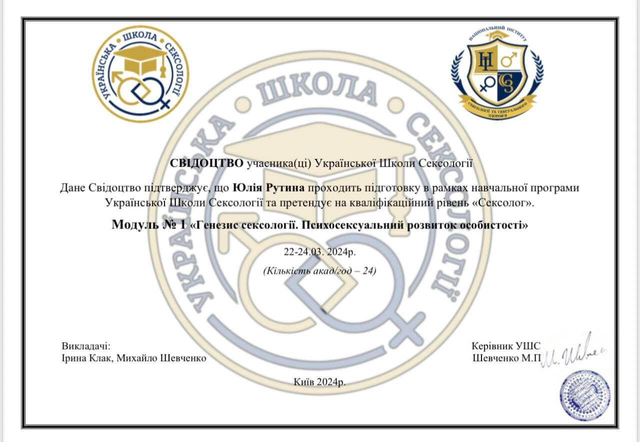 2024 — Модуль №1 «Генезис сексології. Психосексуальний розвиток особистості» (24 акад. години), Українська школа сексології.
