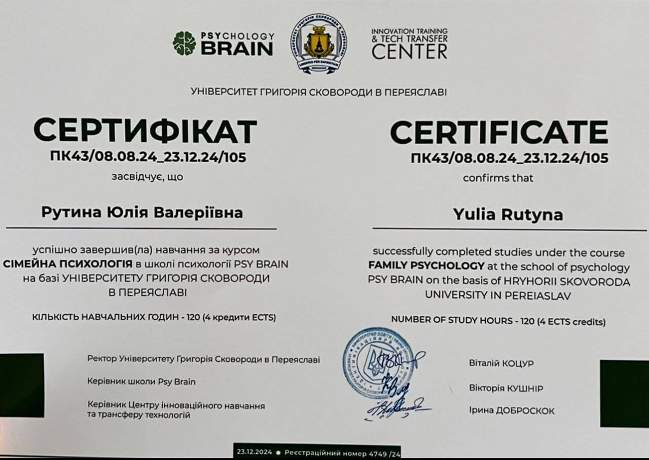 2024 — Сімейна психологія (120 годин, 4 кредити ECTS), школа психології PSY BRAIN, Університет Г. Сковороди в Переяславі.