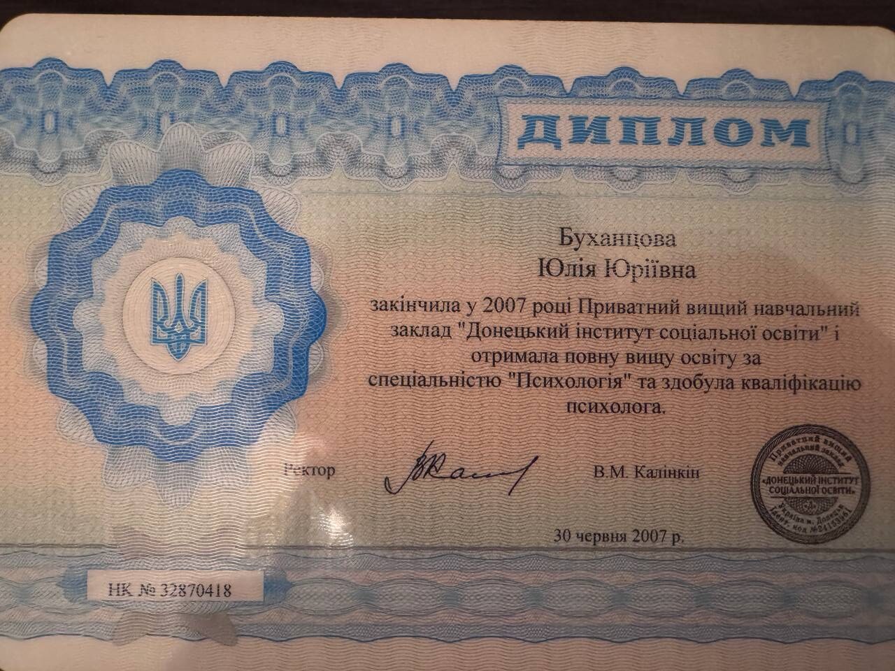 2007 — Диплом психолога, Приватний вищий навчальний заклад «Донецький інститут соціальної освіти»