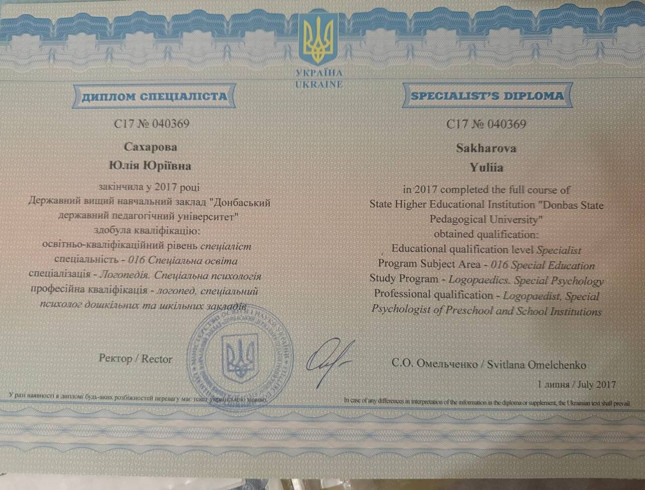 2017 — Диплом спеціаліста, спеціальність «Спеціальна освіта», спеціалізація »Логопедія. Спеціальна психологія», Державний вищий навчальний заклад «Донбаський державний педагогічний університет»