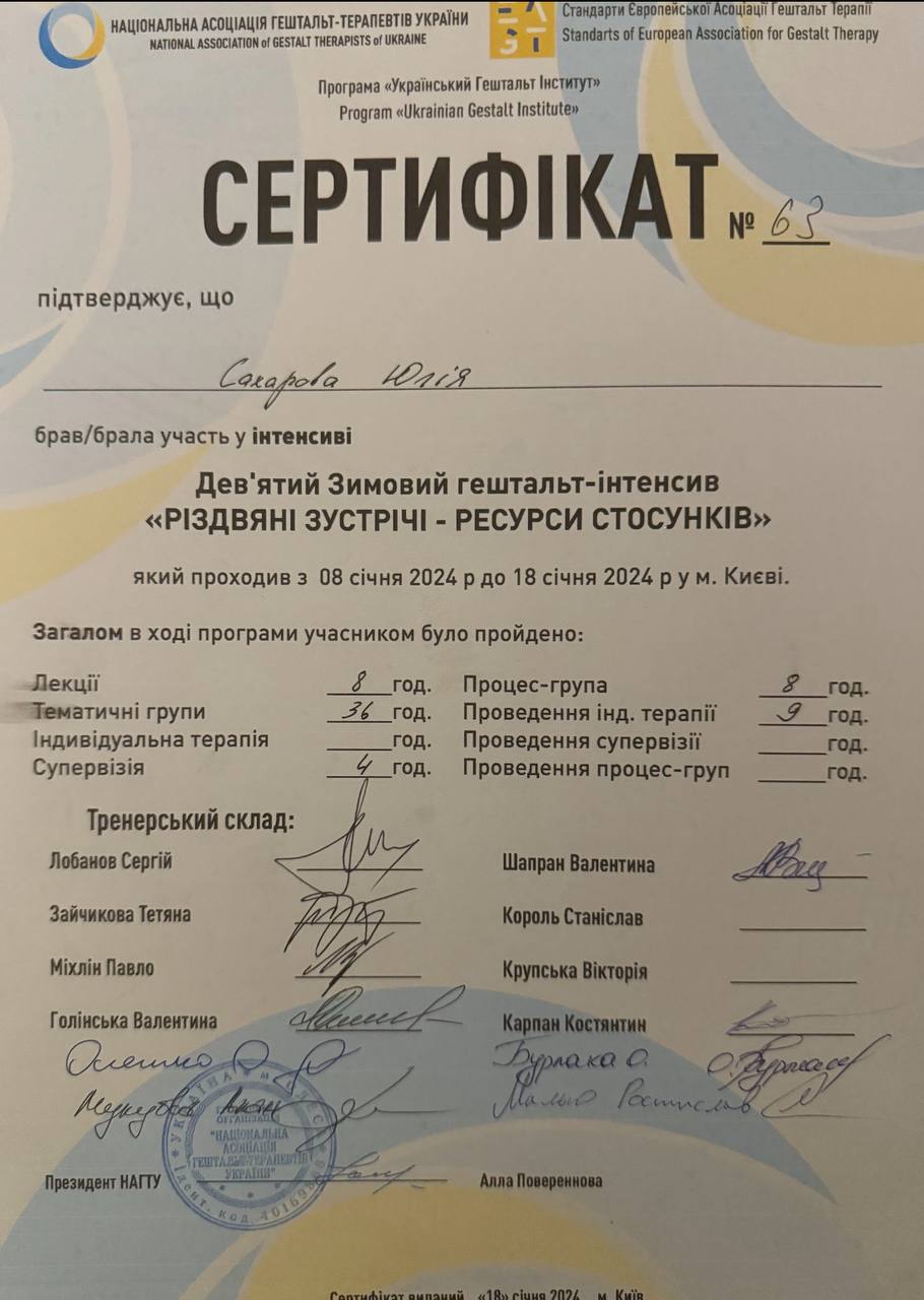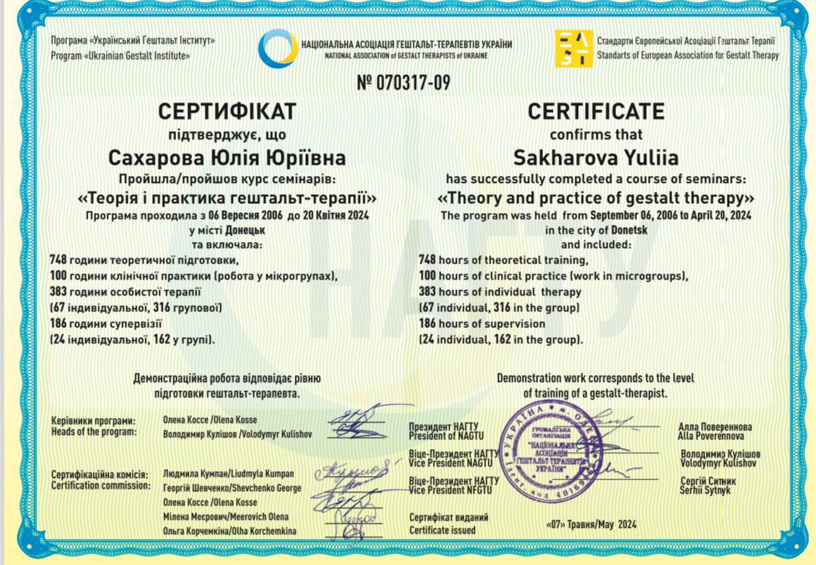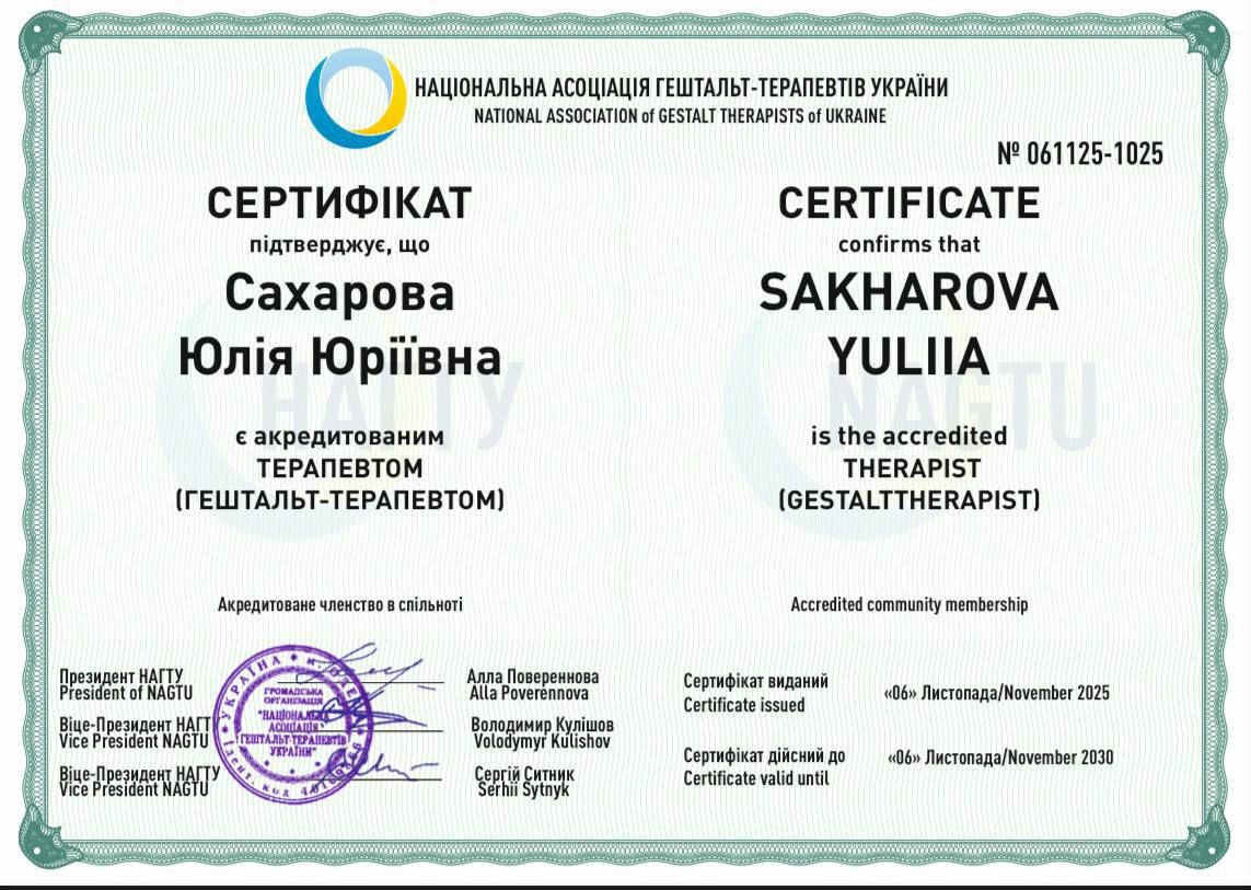 2025— Акредитований гештальт-терапевт (акредитаційне членство), Національна асоціація гештальт-терапевтів України