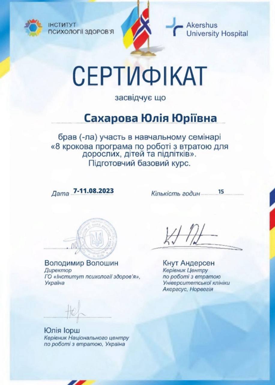2023 — «8-крокова програма по роботі з втратою для дорослих, дітей та підлітків. Підготовчий базовий курс», Інститут психології здоров’я, Akershus University Hospital