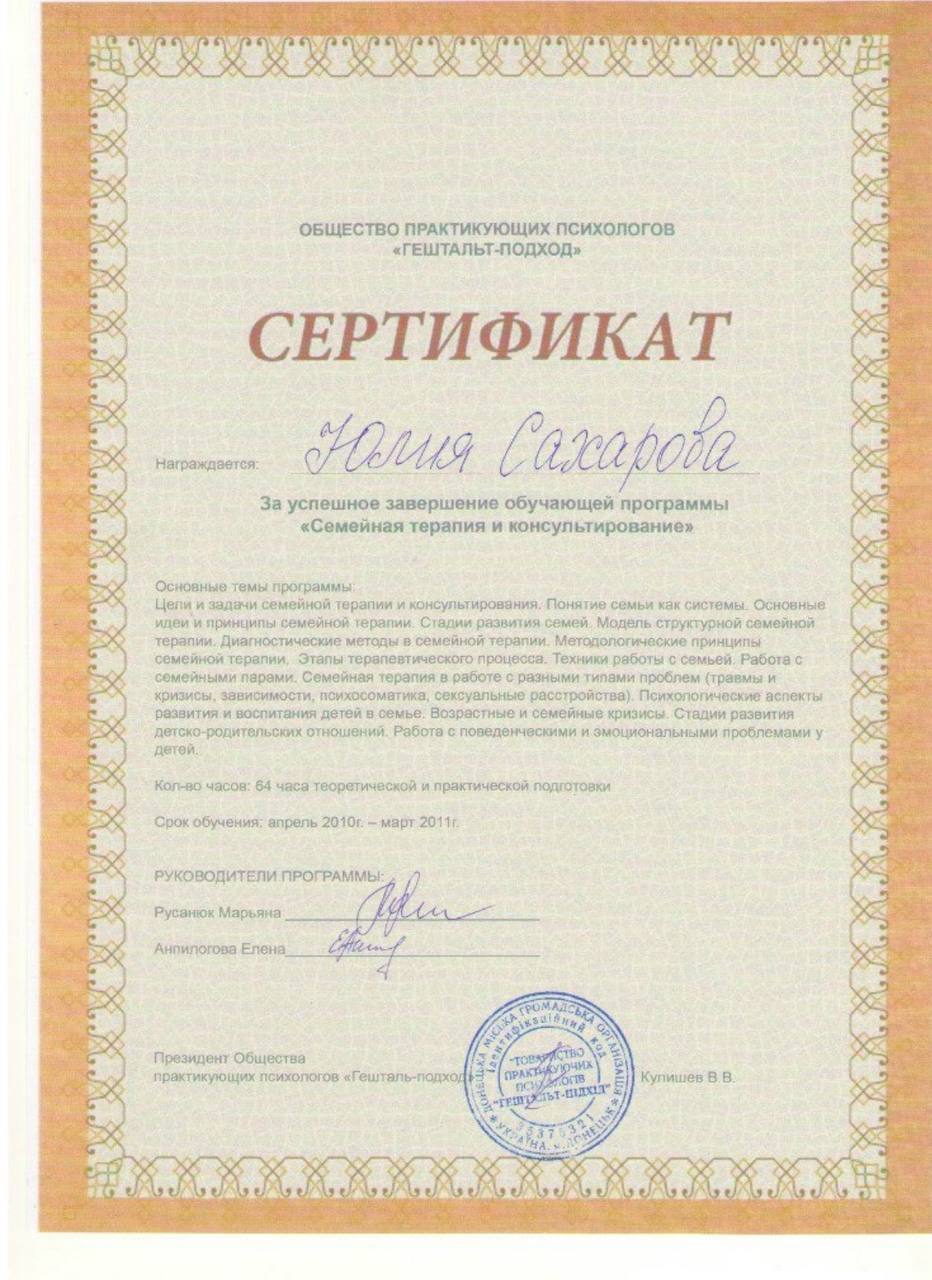 2011 — «Сімейна терапія і консультування», Общество практикующих психологов «Гештальт-подход»