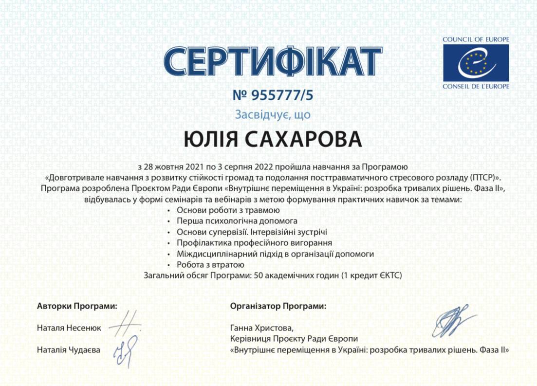 2022 — «Довготривале навчання з розвитку стійкості громад та подолання посттравматичного стресового розладу (ПТСР)», Проєкт Ради Європи