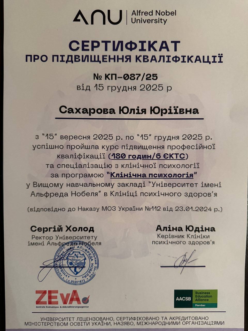 2025 — Курс підвищення кваліфікації та спеціалізація з клінічної психології, Університет імені Альфреда Нобеля (Alfred Nobel University)