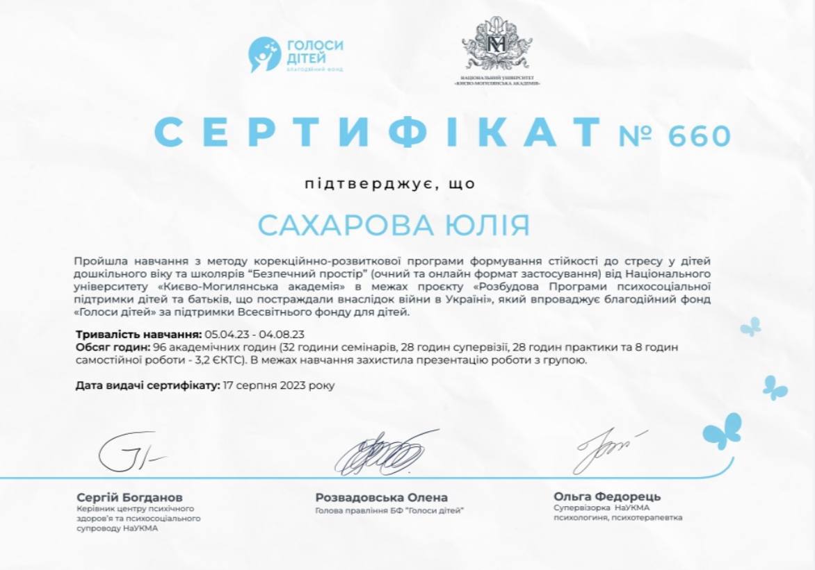 2023 — Кореційно-розвиткова програма формування стійкості до стресу у дітей дошкільного віку та школярів «Безпечний простір», Національний університет «Києво-Могилянська академія», БФ «Голоси дітей»